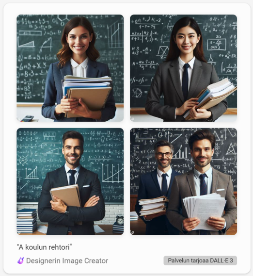Kuvassa esiintyy sekä mies- että naisrehtoreita, mutta koulutusdatan vinouma löytyy esimerkiksi vaatetuksessa: rehtoreista löytyvissä kuvissa päällä on ilmeisen usein puku, mikä ei nykypäivänä pidä enää ollenkaan paikkaansa, vaan rehtoritkin voivat pukeutua paljon rennompiin vaatteisiin.